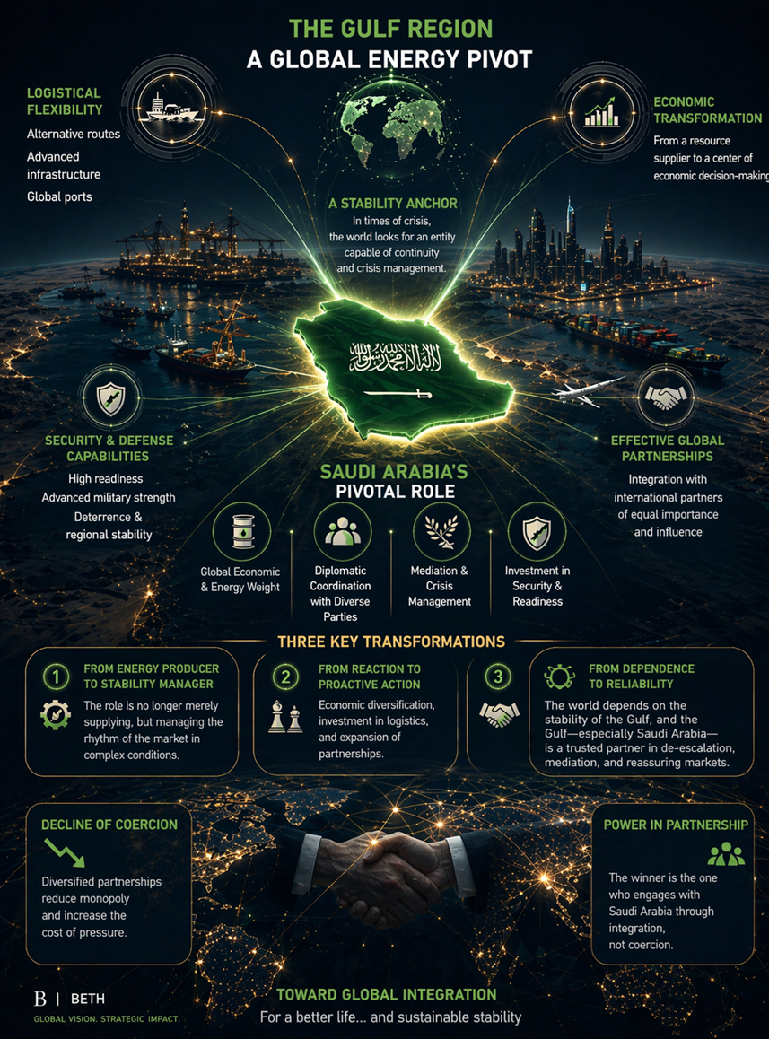and the Gulf—especially Saudi Arabia—has become a partner relied upon in de-escalation, mediation, and reassuring global markets.