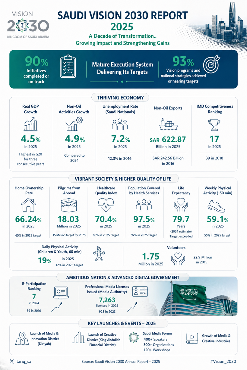 Saudi Vision 2030 has released its annual report for 2025, revealing an advanced set of achievements and indicators that reflect the path of national transformation after a decade since its launch.
