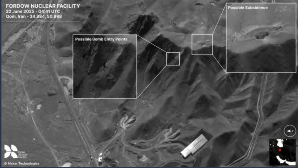 صور الأقمار الصناعية للمواقع التي استهدفتها الضربات الأميركية (فوردو، نطنز، أصفهان) تكشف عدم وجود دمار سطحي واضح، سوى ثقوب دقيقة ناتجة على ما يبدو عن قنابل GBU-57 الخارقة للتحصينات.