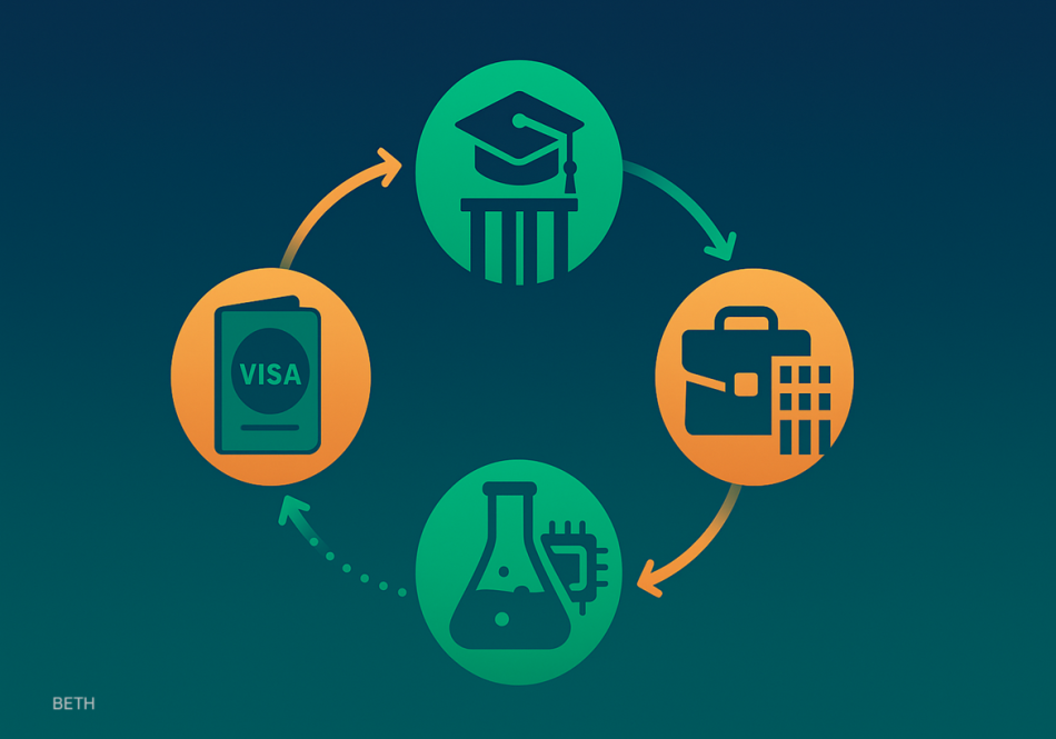 تأشيرة موهبة → مقعد جامعي/منحة → وظيفة/شركة → مختبر وملكية فكرية، مع مسار عودة دائم (Retention).