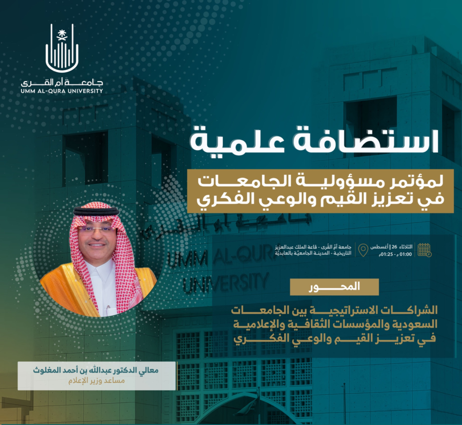 شارك معالي مساعد وزير الإعلام الدكتور عبدالله بن أحمد المغلوث، مساء اليوم، في مؤتمر مسؤولية الجامعات في تعزيز القيم والوعي الفكري، الذي انطلق في جامعة أم القرى برعاية كريمة من خادم الحرمين الشريفين الملك سلمان بن عبدالعزيز آل سعود -حفظه الله-.