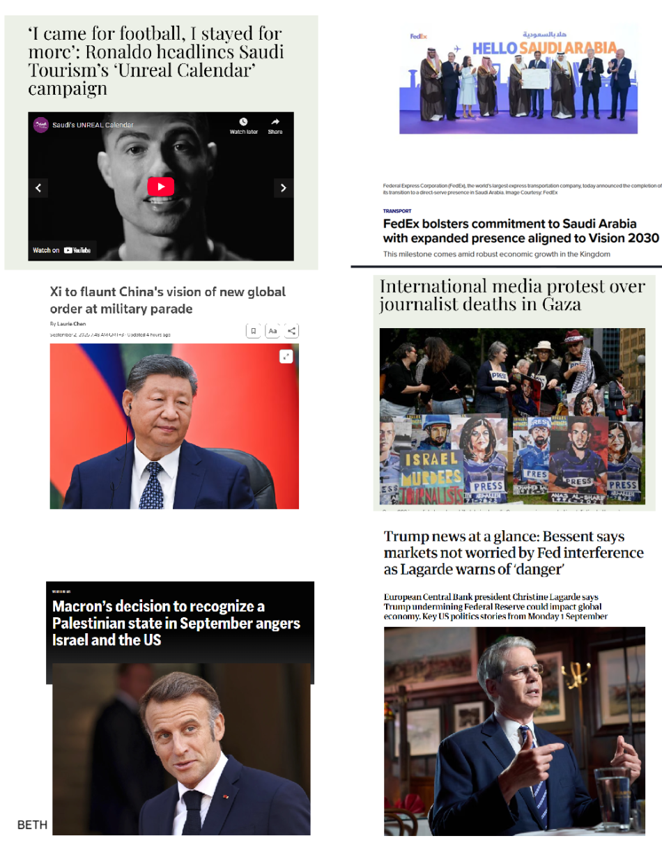 بين توسيع النفوذ الاقتصادي السعودي وخطوات رياضية لشهرة عالمية، تبدو المملكة في طليعة التغيّرات الاستراتيجية. أما على المسرح العالمي، فتعكس الاستعراضات العسكرية والتحركات الإعلامية تباينات في القوة والرسائل، من بيئة متعددة الأقطاب إلى تضامن عالمي مع القضايا الإنسانية.