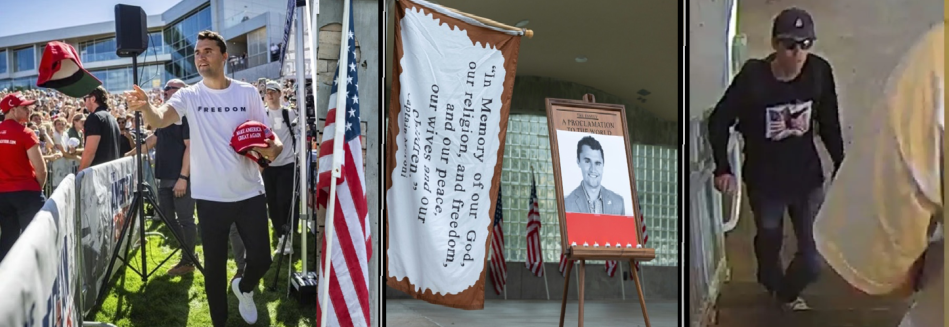 الصورة الوسطى: عرض تذكاري لـ تشارلي كيرك (علم أو لافتة تذكارية)، من فعالية أو مراسم تأبينية نُظمت بعد مقتله.