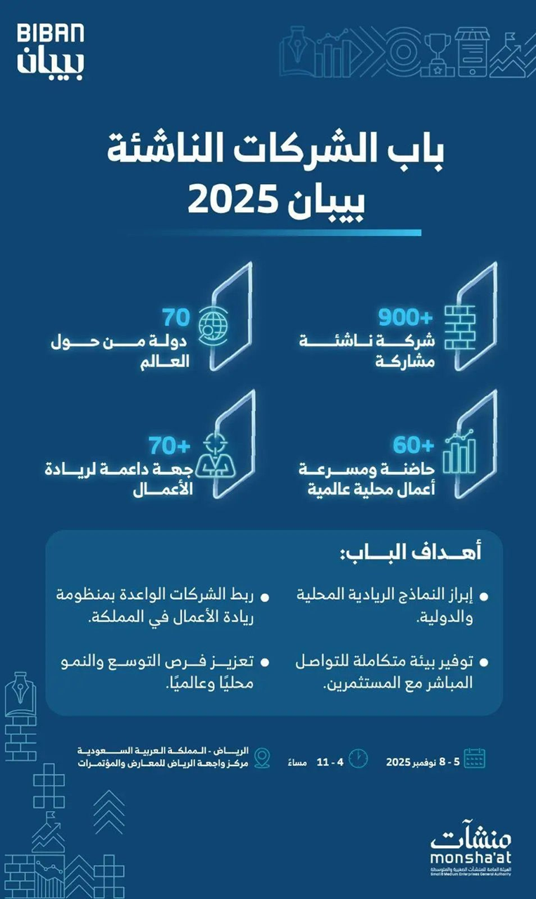 تستعد العاصمة السعودية لاحتضان ملتقى “بيبان 2025” الذي تنظمه الهيئة العامة للمنشآت الصغيرة والمتوسطة (منشآت) خلال الفترة من 5 إلى 8 نوفمبر المقبل في مركز واجهة الرياض للمعارض والمؤتمرات، تحت شعار: