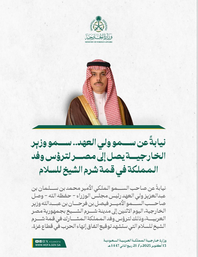 نيابةً عن صاحب السمو الملكي الأمير محمد بن سلمان بن عبدالعزيز آل سعود، ولي العهد رئيس مجلس الوزراء – حفظه الله – وصل صاحب السمو الأمير فيصل بن فرحان بن عبدالله، وزير الخارجية، اليوم إلى مدينة شرم الشيخ بجمهورية مصر العربية، لترؤس وفد المملكة المشارك في قمة شرم الشيخ للسلام، التي تُعدّ الحدث الأبرز في مسار التسوية الإقليمية، ومن المقرر أن تشهد توقيع اتفاق إنهاء الحرب في قطاع غزة.