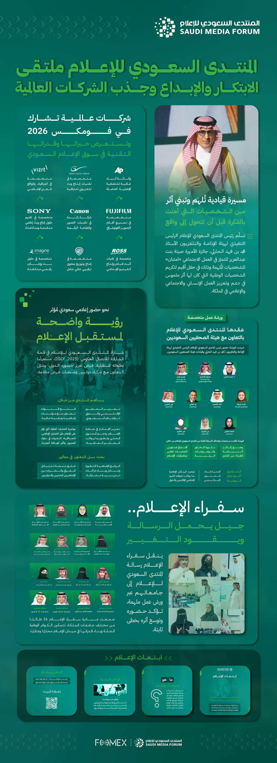 يواصل المنتدى السعودي للإعلام تعزيز موقعه كأكبر منصة تجمع رموز الإعلام والاتصال في المنطقة، من خلال برامج نوعية تجمع بين الإبداع والابتكار والتقنية، وتستقطب نخبة من الشركات العالمية والمواهب السعودية الواعدة.