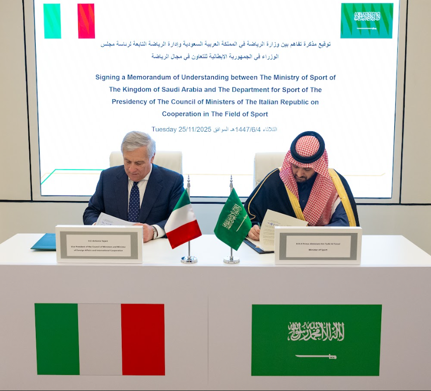 وقّع صاحب السمو الملكي الأمير عبدالعزيز بن تركي الفيصل، وزير الرياضة ورئيس اللجنة الأولمبية والبارالمبية السعودية، اليوم الثلاثاء 25 نوفمبر 2025م، مذكرة تفاهم مع نائب رئيس مجلس الوزراء ووزير الشؤون الخارجية والتعاون الدولي في جمهورية إيطاليا السيد أنطونيو تاياني، لتعزيز التعاون المشترك في المجالات الرياضية بين البلدين.