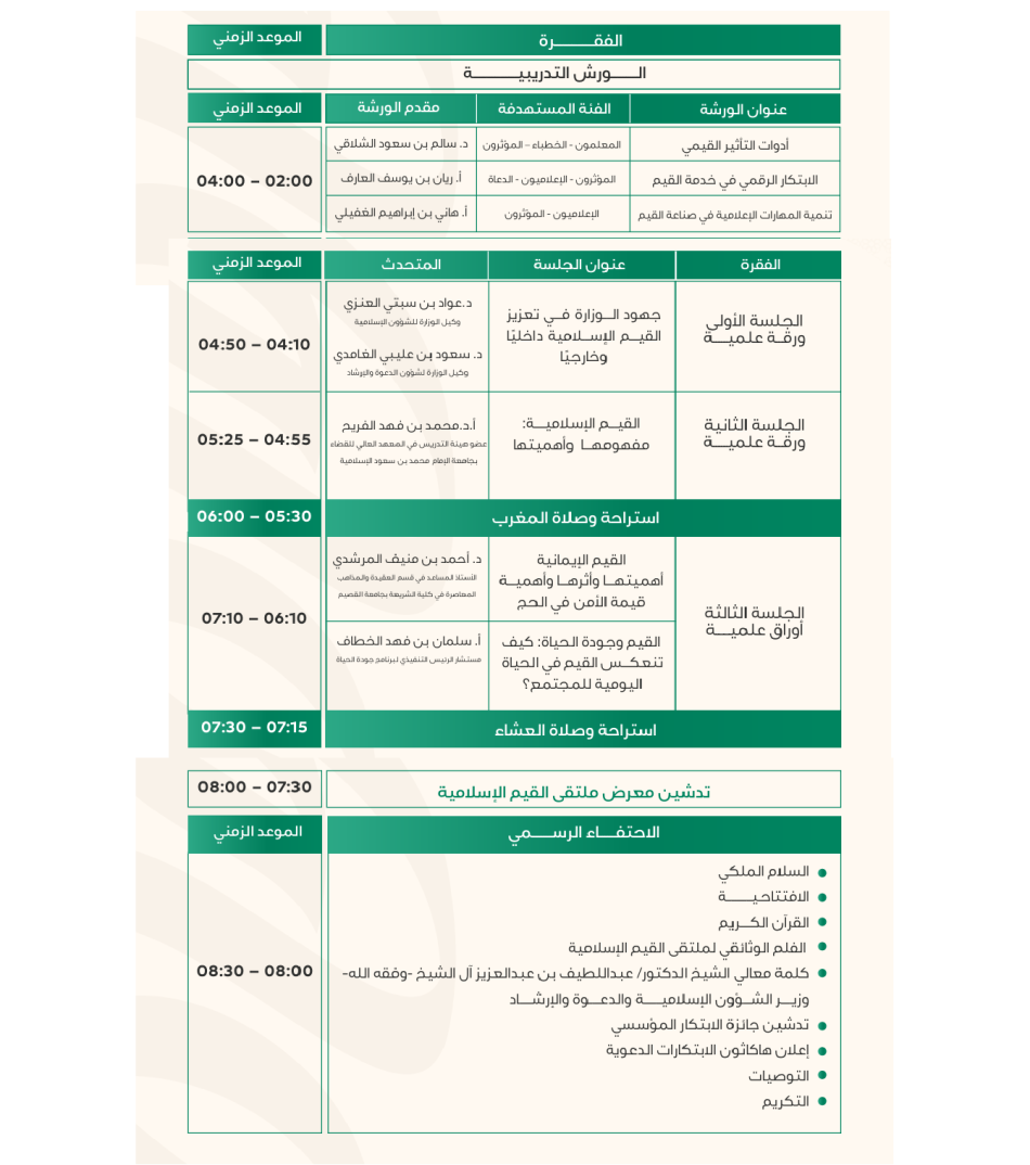 برعاية صاحب السمو الملكي الأمير فيصل بن بندر بن عبدالعزيز، أمير منطقة الرياض، تنطلق غدًا الأثنين في الرياض فعاليات النسخة الأولى من ملتقى «القيم الإسلامية»، الذي تنظمه وزارة الشؤون الإسلامية والدعوة والإرشاد تحت شعار «قيم راسخة لحياة أفضل».