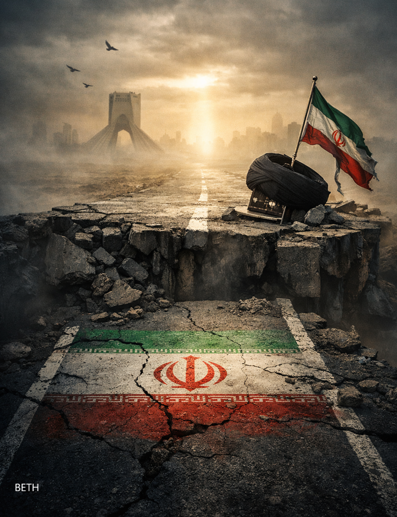 طريق متصدّع يتوسط علم إيران المرسوم على الأرض، ينتهي عند حافة مجهولة، بينما يظهر في الأفق ضوء شروق خلف ملامح طهران. ترمز الصورة إلى لحظة مفصلية في تاريخ إيران، حيث يلتقي إرث النظام القائم مع سؤال المستقبل: ماذا بعد؟
