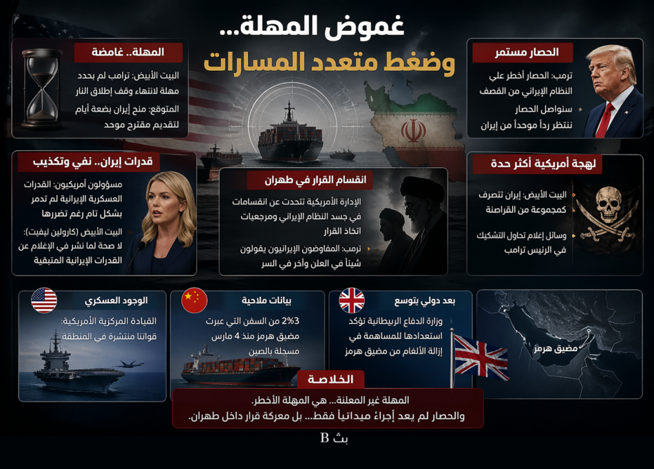 تتسع حالة الغموض حول مهلة وقف إطلاق النار بين الولايات المتحدة وإيران، وسط تضارب في التصريحات، وتصاعد في الرسائل السياسية والعسكرية، في وقت تنتظر فيه واشنطن ما تصفه بـ“موقف إيراني موحد”.