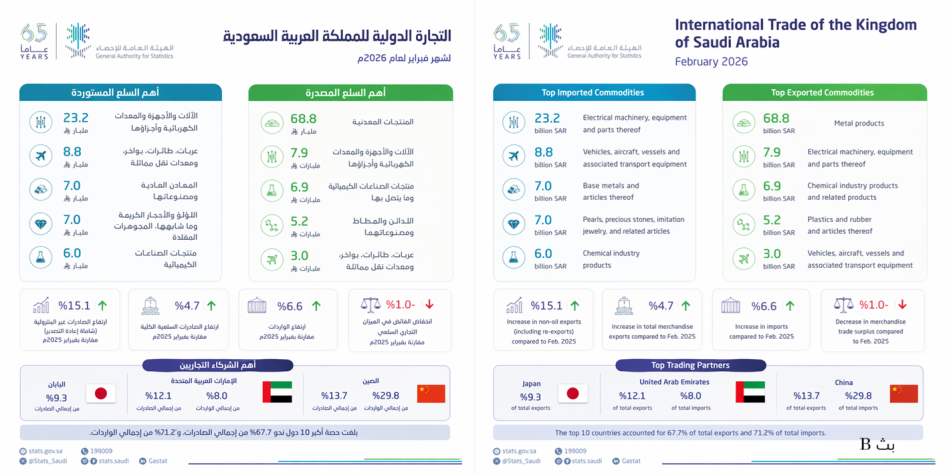 سجّلت الصادرات غير النفطية في المملكة العربية السعودية نموًا ملحوظًا خلال فبراير 2026، في مؤشر يعكس استمرار تحسّن هيكل التجارة الخارجية وتقدّم مسار التنويع الاقتصادي.