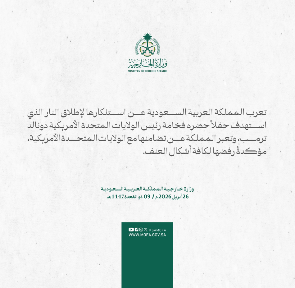 أعربت المملكة العربية السعودية عن استنكارها حادث إطلاق النار الذي استهدف حفلًا حضره الرئيس الأميركي دونالد ترامب، مؤكدة تضامنها مع الولايات المتحدة، ورفضها لكافة أشكال العنف.